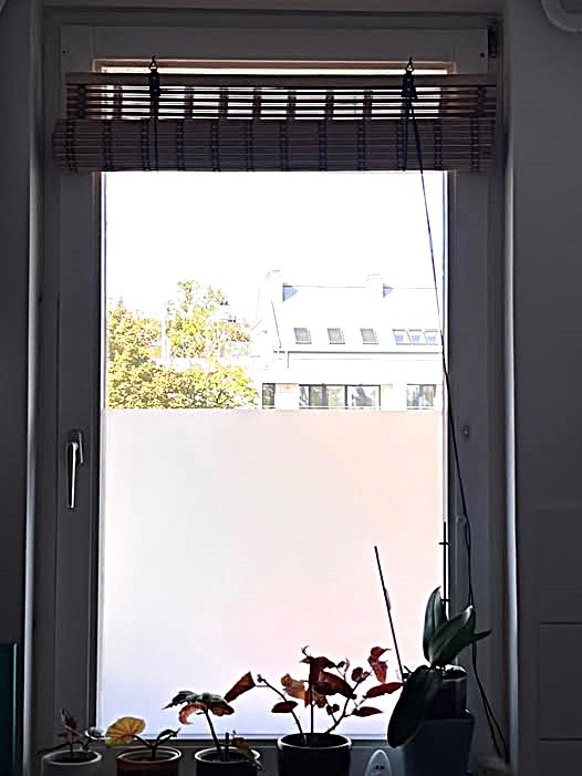 5. Tükörfólia ablakra illesztése: tegyétek a vízzel megnedvesített fóliát az így előkészített oldalával az ablakra. Az üveg tetején kezdjétek, és szépen illesszétek a helyére. Ebben a nedves állapotban még viszonylag könnyen lehet igazítani, csúsztatni a fóliát. Permetezd be tiszta vízzel a fólia felső rétegét is.