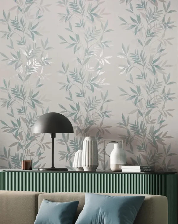 Mona skandináv stílusú finoman ívelő fehér- mentazöld színű levélmintás tapéta 82461